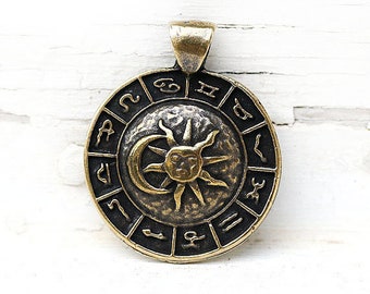 Zodiac Sun and Moon pendant bead Antique brass charm Horoscope Zodiac jewelry Astrology Greek metal casting - F416