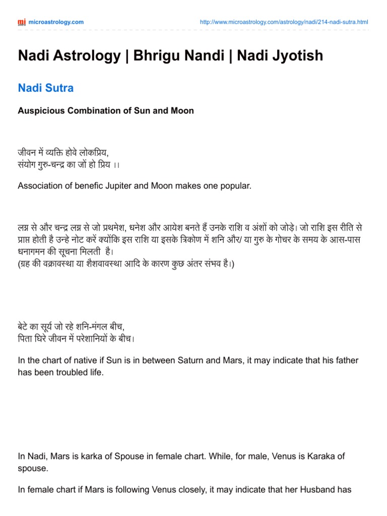 Bhrigu Nandi Nadi: A Classical Work Based on NADI Technique of ... No method or principle for Nadi Astrology is mentioned in the book. It is just a collection of horoscopes of people you do not know. Instead of learning about ...