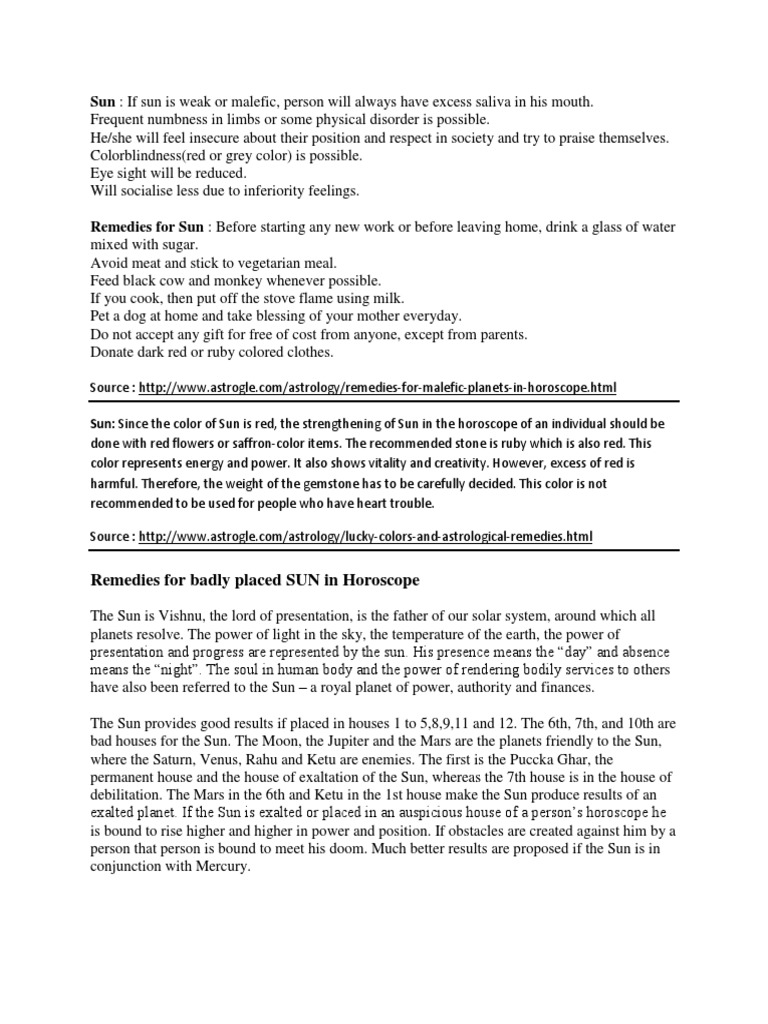 Remedies for Malefic Sun - Free online vedic astrology Vedic astrology provides different remedies to lessen negative impact of Nakshatras if you are born in any inauspicious Yoga formed at the time of birth such as Gandmoola, Gandant or Abhuktmoola. Similarly, you should use the remedies for the planets that create problems for you during their transit. These remedies can help pacify and increase auspiciousness of planets.