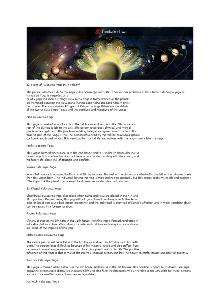 Different Types of KaalSarpa Yoga |kalasarpa dosha |Kala Sarpa Yoga in ... From lagna to seventh house the planets are (Ravi,Chandra,Kuja,Budha,Guru,Sukra and Sani) are placed between Rahu and Ketu is know Ananta Kala Sarpa Dosham. EFFECTS: Troubles in family life, and chronic health problems. 2.From Second house to seventh house if these planets are placed it is known as GULIKA KALASARPA DOSHAM