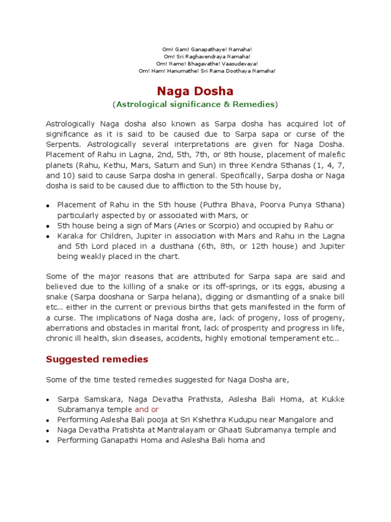 Naga (Naag or Sarpa) Dosha - Nature, Cause, Effects and Remedy Hari Om. Naag dosha also known as Sarpa dosha is a powerful limitation in any chart or horoscope causing obstacles in many ways. The Dosha happens due to rage and extreme anger by the God of Serpent. The Dosha is primarily caused by certain past bad actions or Nishidda Karma. Rahu represents Maya (Illusion) and is said to be the head and Ketu ...